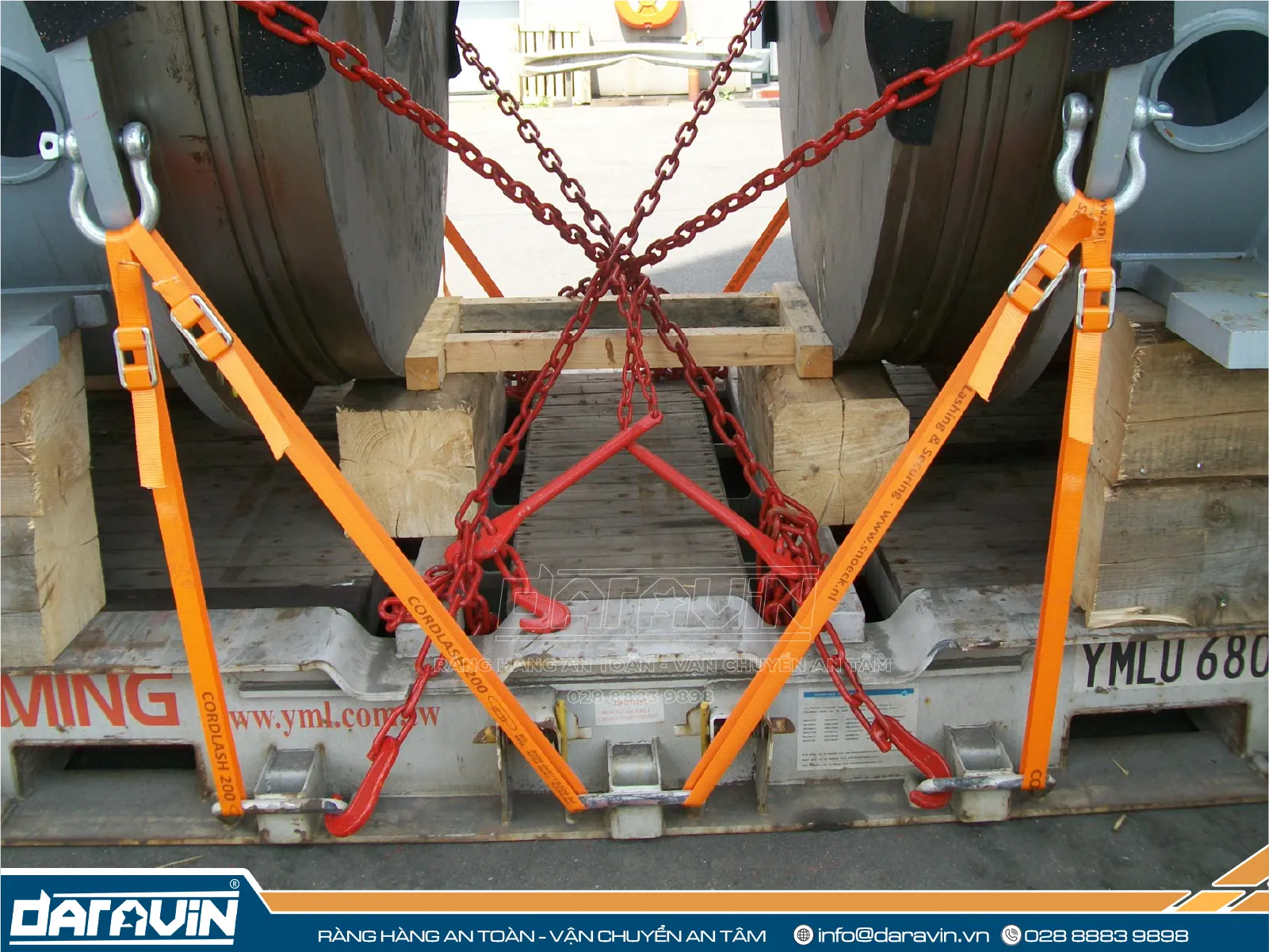 Xích chằng hàng (Chain Lashing): Xích chằng hàng được làm từ thép có độ bền cao, thường được sử dụng để cố định các loại hàng hóa siêu trường siêu trọng hoặc có cạnh sắc nhọn mà dây chằng thông thường không đáp ứng được.