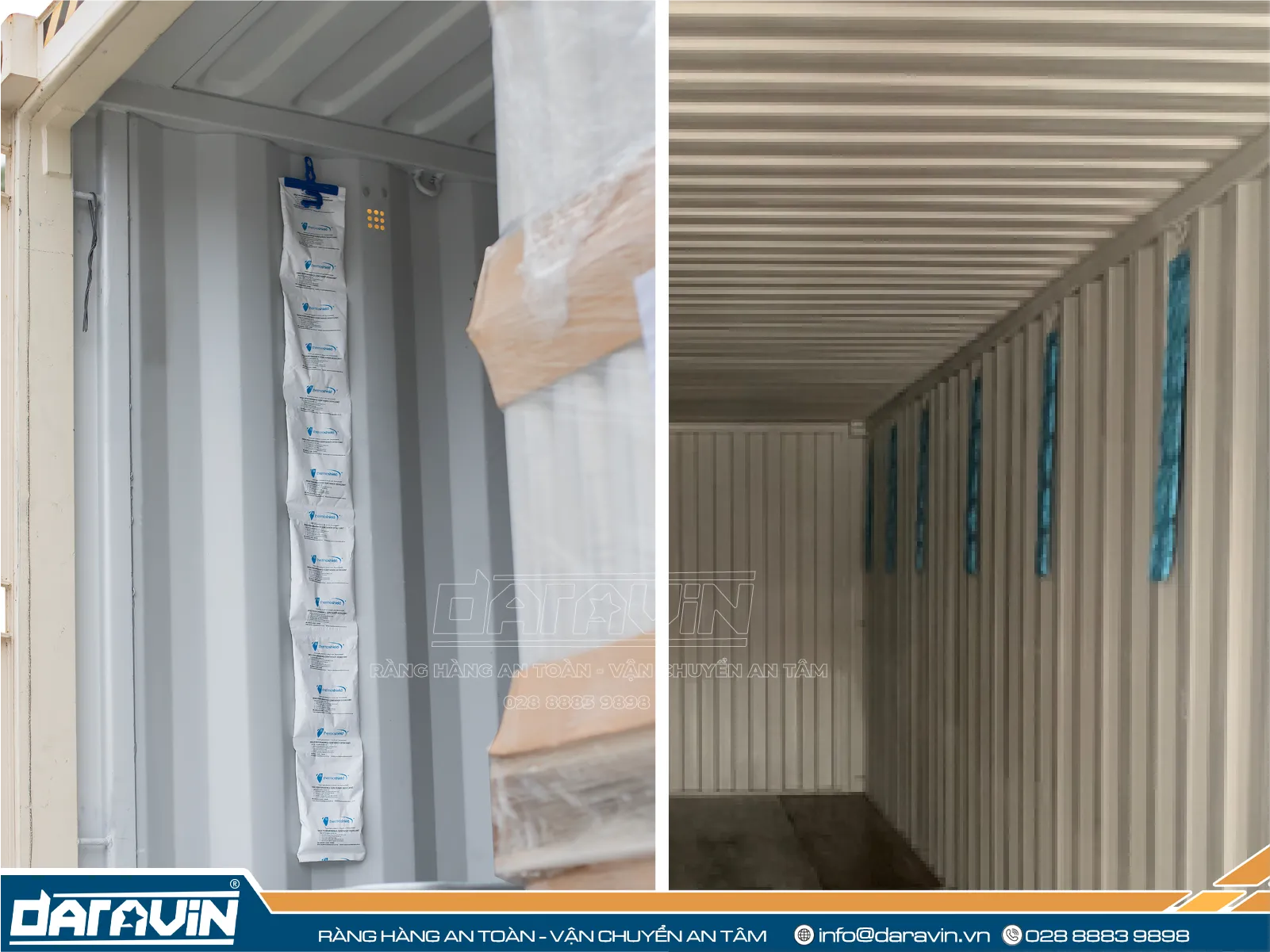 Đảm bảo container khô ráo: Quét sạch container và đảm bảo không còn nước đọng hoặc ẩm ướt trước khi xếp hàng và đặt túi hút ẩm.