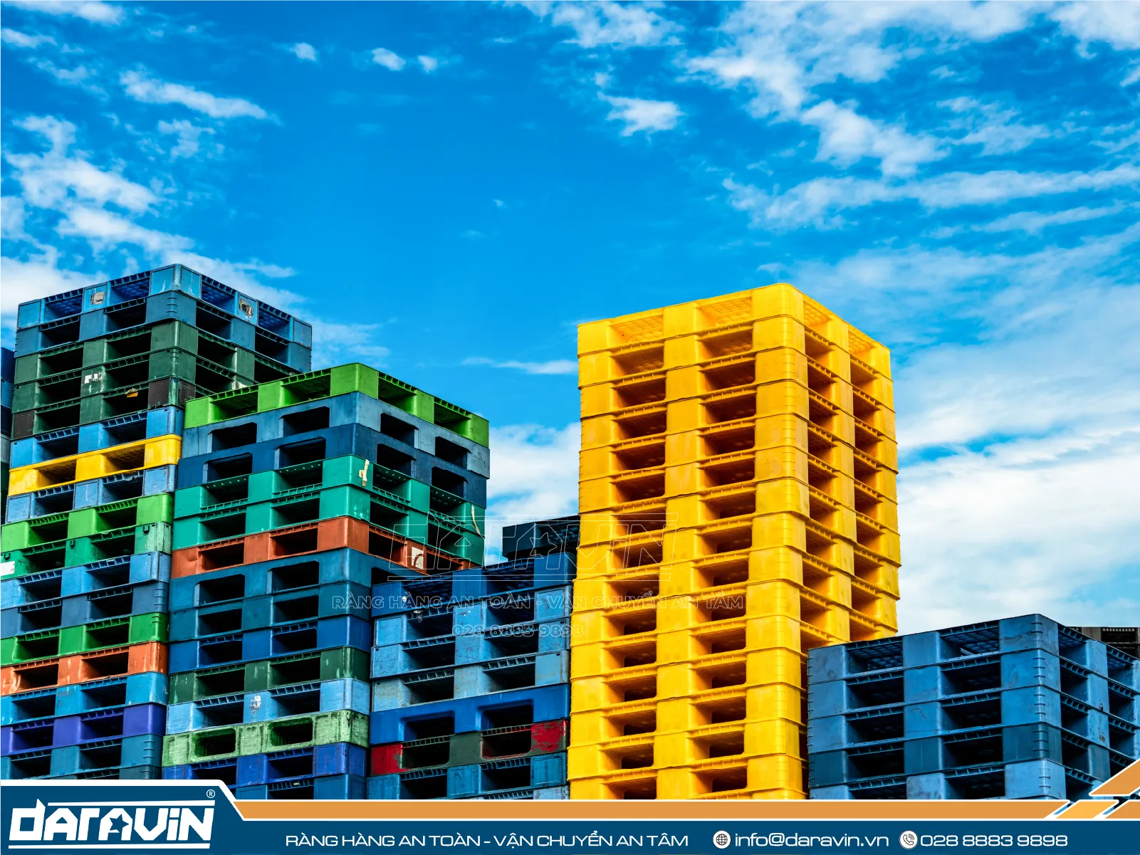 Tránh ánh nắng trực tiếp: Tia UV từ ánh nắng mặt trời có thể làm giòn, phai màu và giảm độ bền của nhựa theo thời gian. Nên lưu trữ pallet trong nhà hoặc dưới mái che.