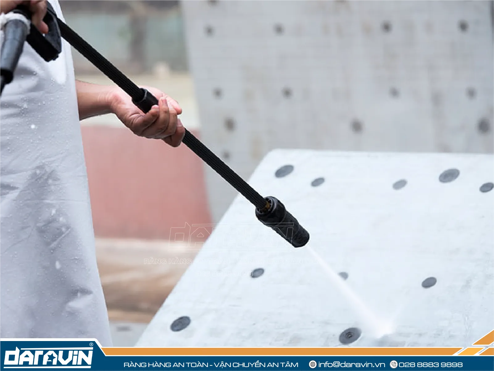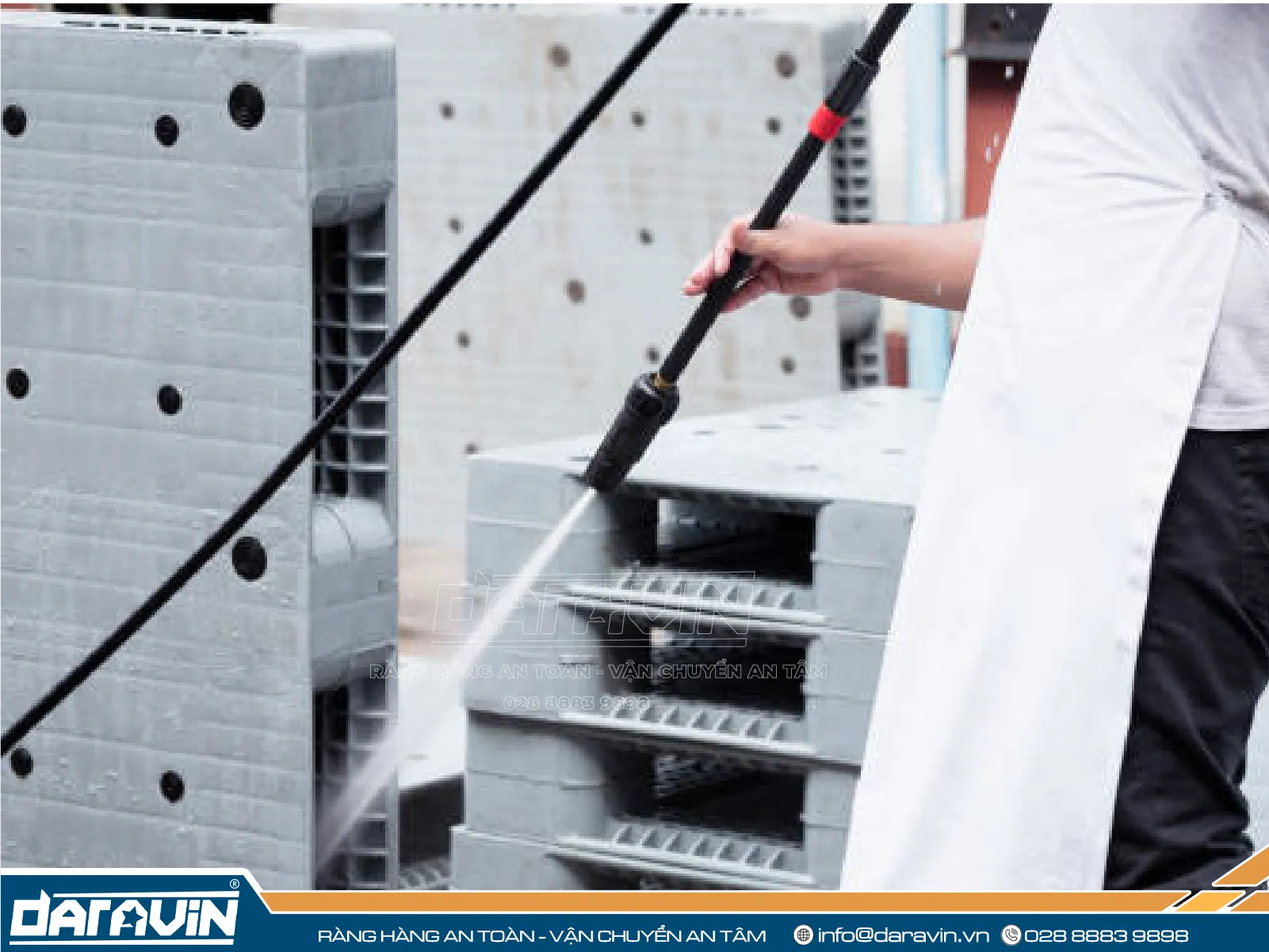 Sử dụng vòi xịt áp lực cao: Dùng vòi xịt nước áp lực cao (ví dụ: máy rửa xe) để làm sạch toàn bộ bề mặt pallet, đặc biệt là các khe rãnh, lỗ thoát nước. Áp lực nước sẽ giúp đánh bật các cặn bẩn còn sót lại và làm mềm các vết bẩn khô.